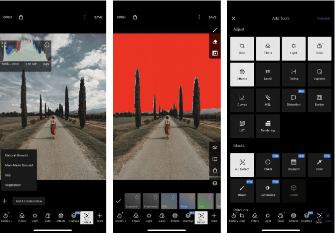 يمكنك بدء التحرير باستخدام أدوات متقدمة مثل المنحنيات والتراكبات/التدرجات والمزيد. ثم يمكنك إضافة مفاتيح فريدة مع عوامل التصفية والتركيب والإطارات والحدود والخطوط. كما يدعم التطبيق الصور بتنسيق RAW.