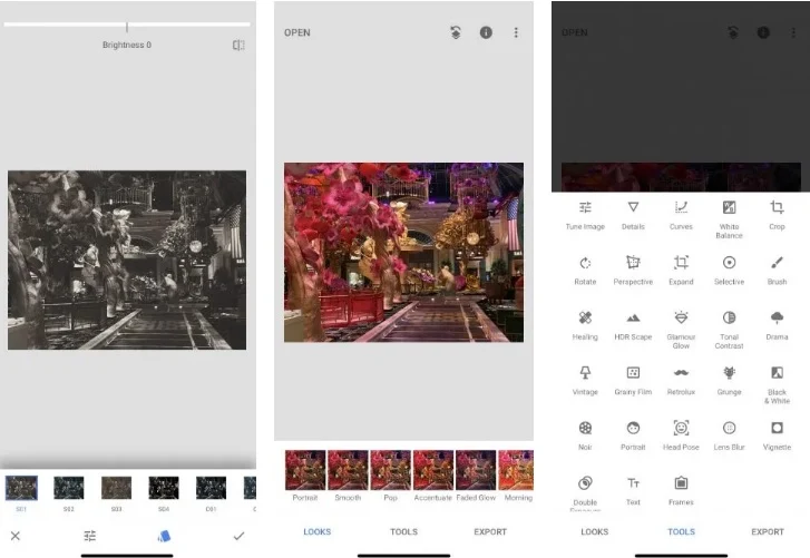 بالإضافة إلى العديد من عوامل التصفية، كما يشير Snapseed إلى المظهر، هناك مجموعة مذهلة من أدوات التحرير للاختيار من بينها. وتتراوح هذه الخيارات من الأساسيات إلى التغييرات في المنظور، والصبغة الانتقائية، والنطاق الديناميكي العالي الفوري، والمرشحات والخيارات الشاملة أحادية اللون.