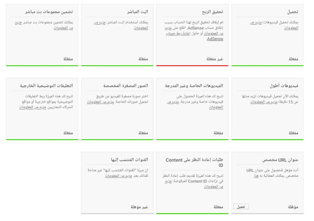 بعدما أنشأت القناة بنجاح سنتحدث الان عن الامور التي ستحتاجها و الشروط اللازمة للحصول عليها ، و في الصورة التالية مجمل الخصائص التي التي توفرها لك اليوتيوب و سنتطرق الى شرح كل واحدة منها بالتفصيل.هذه الخصائص او المميزات ستجدها انت على هذا الشكل