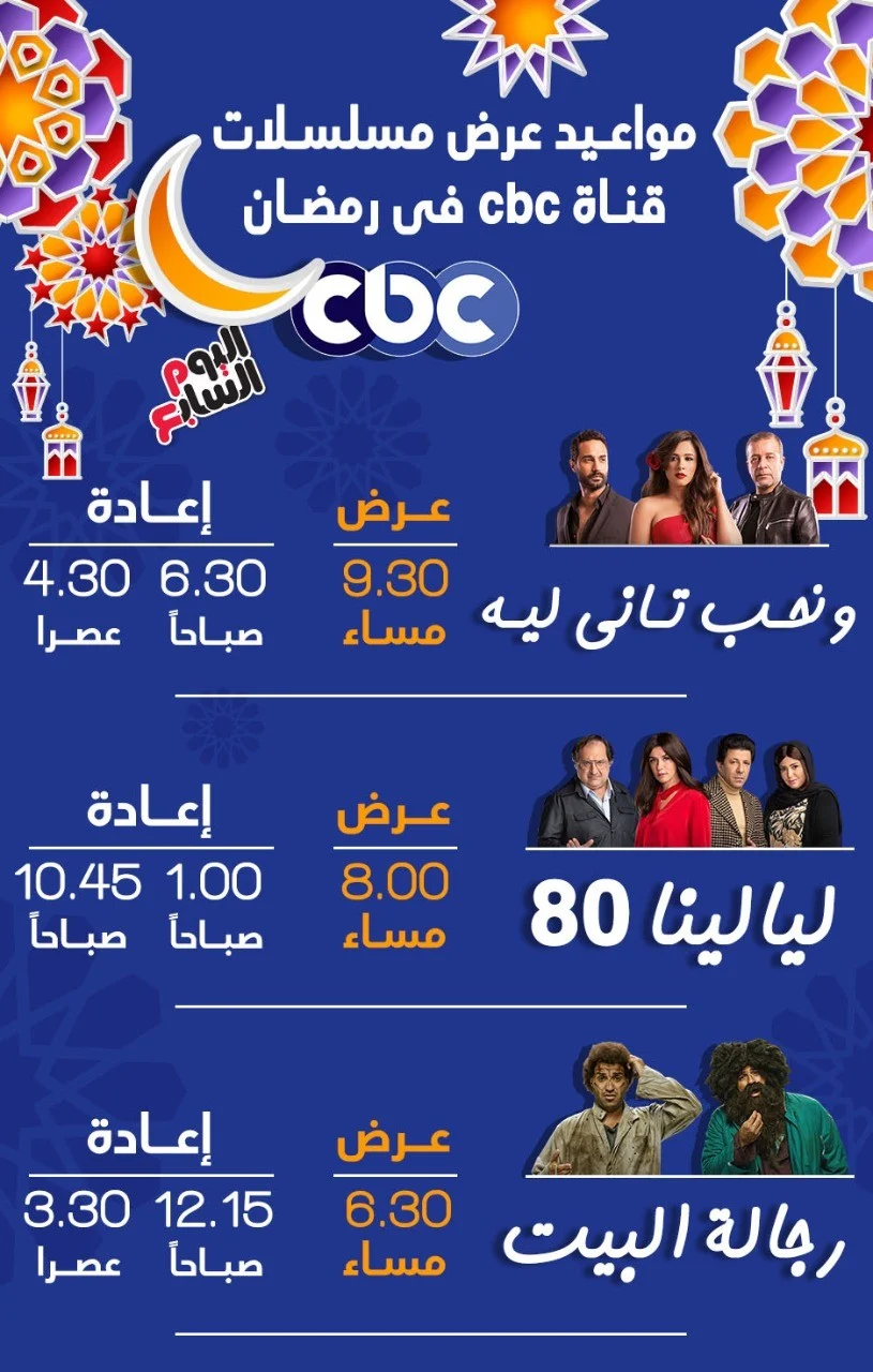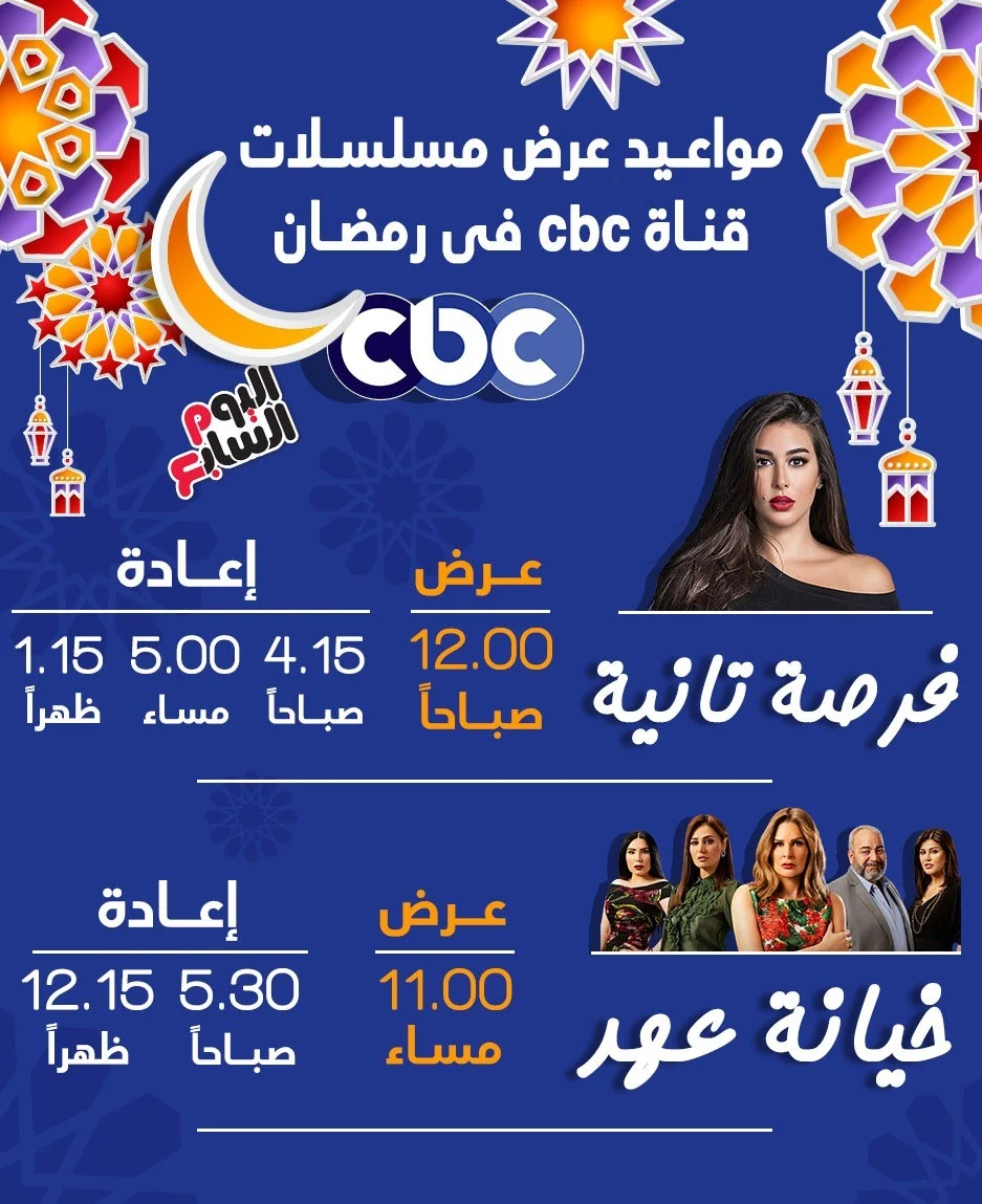 وعلي قناة CBC يذاع مسلسل " فرصة تانية " لياسمين صبري الساعة الثانية عشر صباحا ويعاد ثلاث مرات في الرابعة و15 دقيقة صباحا وفي الخامسة مساء وفي الواحدة و15 دقيقة ظهرا ، أما مسلسل " خيانة عهد " للنجمة يسرا فيذاع الساعة الحادية عشر مساء ويعاد مرتين الساعة الخامسة والنصف صباحا والساعة الثانية عشر والربع ظهرا ، كما يذاع مسلسل " ونحب تاني ليه " لياسمين عبد العزيز الساعة التاسعة والنصف مساء ويعاد مرتين في السادسة والنصف صباحا وفي الرابعة والنصف عصرا كما يذاع مسلسل " ليالينا 80 " الساعة الثامنة مساء ويعاد مرتين في الواحدة صباحا والساعة العاشرة و45 دقيقة صباحا ، أما مسلسل " رجالة البيت " فيذاع الساعة السادسة والنصف مساء ويعاد مرتين الساعة الثانية عشر و15 دقيقة صباحا والساعة الثالثة والنصف عصرا .