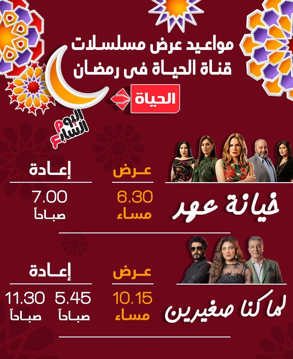 يعرض اليوم الجمعة أول أيام شهر رمضان على قناة الحياة مسلسل النجمة يسرا "خيانة عهد" الساعة السادسة والنصف ويعاد السابعة صباحا من اليوم التالي، ويعرض مسلسل " لما كنا صغيرين " لمحمود حميدة وخالد النبوي وريهام حجاج الساعة العاشرة والربع مساء ويعاد في اليوم التالي في الساعة السادسة إلا الربع صباحا ويعاد مرة أخرى الساعة الحادية عشرة والنصف صباحا .