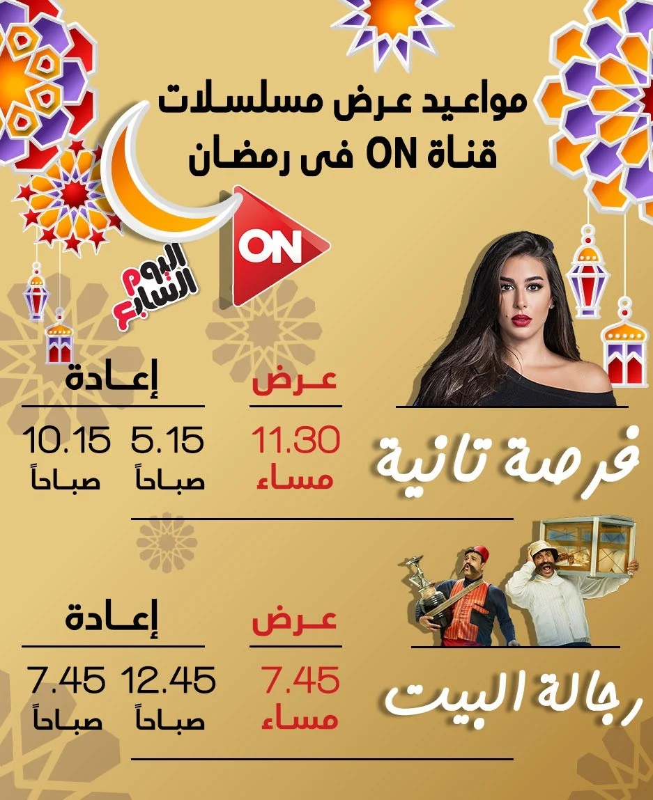 أما قناة on فتعرض مسلسل " فرصة تانية " لياسمين صبري الساعة 11 ونصف مساء ويعاد الساعة الخامسة و15 دقيقة صباحا والساعة العاشرة و15 دقيقة صباحا ، أما مسلسل " رجالة البيت " لأحمد فهمي وأكرم حسني فيذاع الساعة السابعة و45 دقيقة مساء ويعاد مرتين الساعة الثانية عشر و45 دقيقة صباحا والساعة السابعة و45 دقيقة صباحا .
